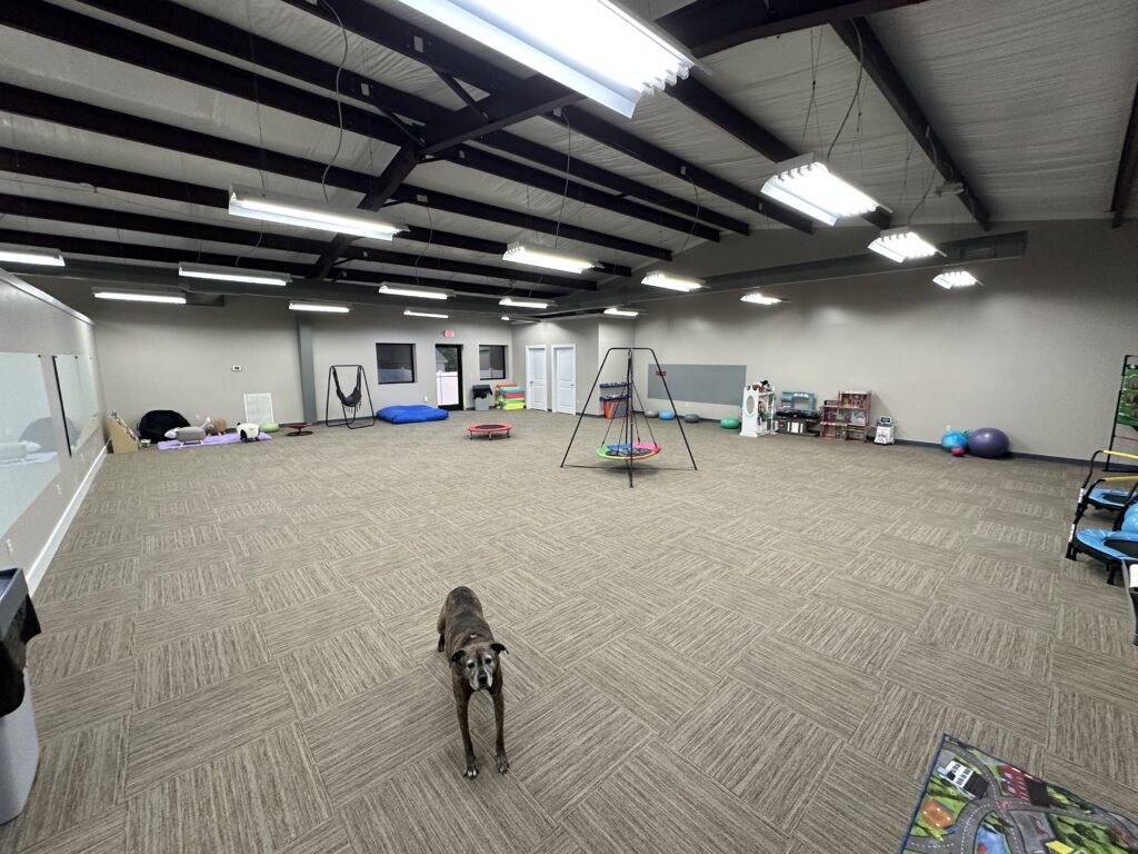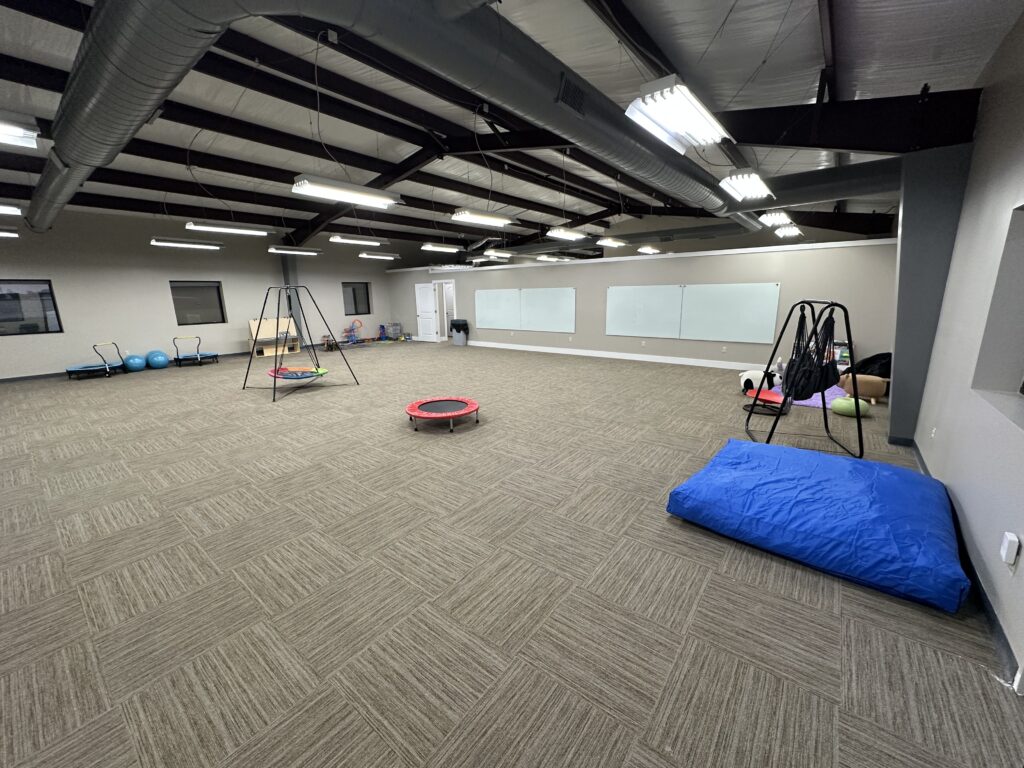 The Creek Terrace ABA-LLC Clinic features individual treatment rooms for ABA therapy, Occupational therapy, and Speech therapy. There is also a large communal space with varying dividing wall heights for individual work, a full size classroom, and a huge movement room. The property also has a large outdoor area, featuring both a concrete pad for tricycles, bicycles and basketball and a grassy area for soccer, football, croquet, and even a playground!